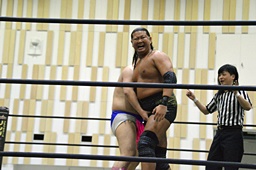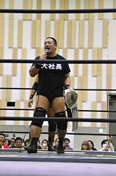 平田ヘッドロック、大石ロープに振る、平田ショルダーブロック(左写真)。