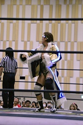 高木コーナーに上ってドラゴンリングイン、勝俣はガットショットで迎撃(左写真)。