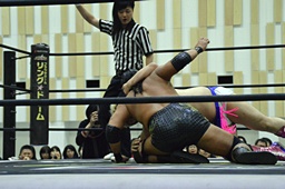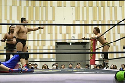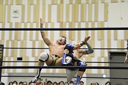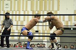 ロックアップ、大石ヘッドロック、平田腕取って切り返す(右写真)。
