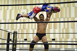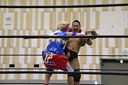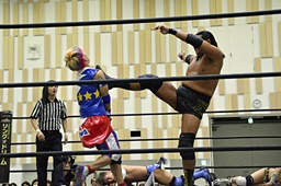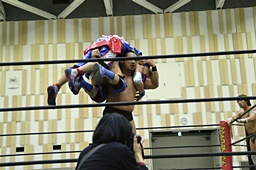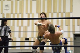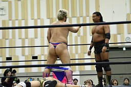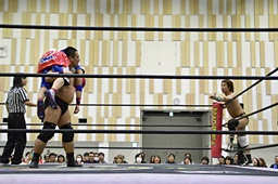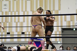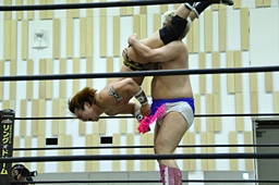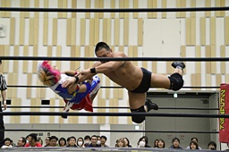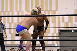 ディーノコーナーに振って突っ込む、平田カウンターのキック、ロープに飛んでコルバタ(右写真)。