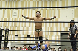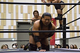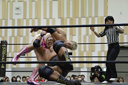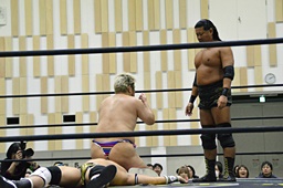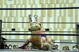 ディーノコーナーに帰ろうとする平田の足を取るが平田はキャッチ延髄(左写真)、大鷲にタッチ。
