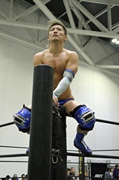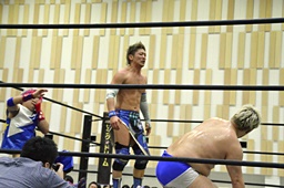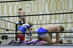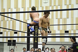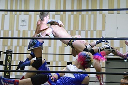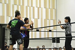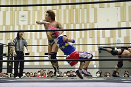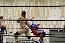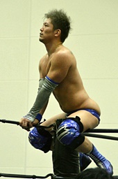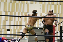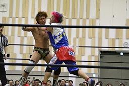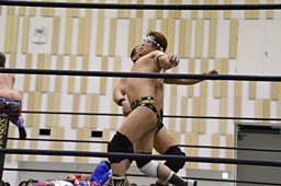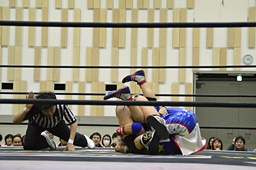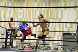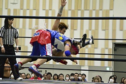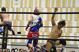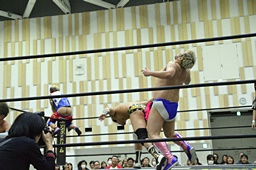 ロープに飛ぶ、平田首固め(左写真)、カウント3。