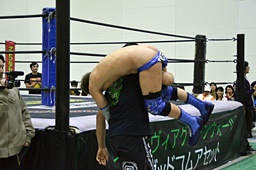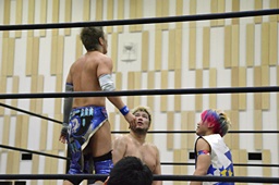 大石が平田をシーソーホイップ、ディーノがキャッチしてキス(右写真)。