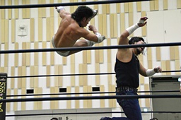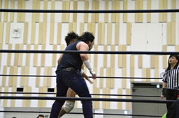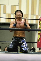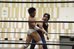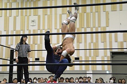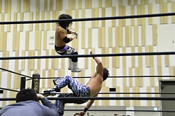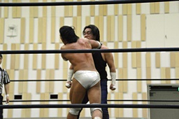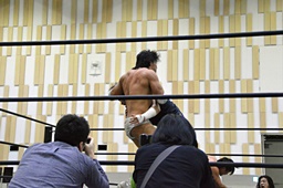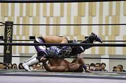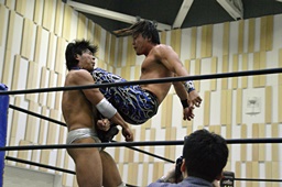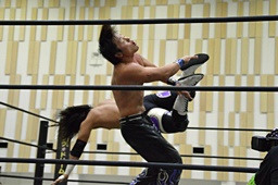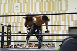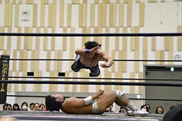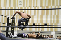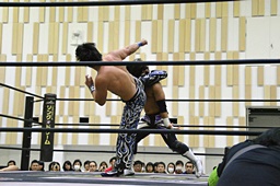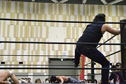 佐々木ドロップキック、コーナーに上ってダイビングエルボードロップ、HARASHIMAは両ヒザを立てて山折りの形で受け止める(右写真)。