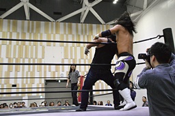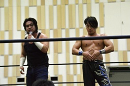 ミサイルキック(左写真)、その勢いで(?)宮武がバックフリップ。宮武カバー、カウント2。