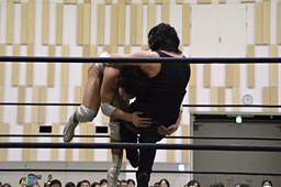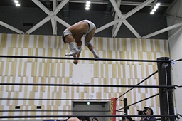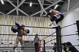 佐々木がボディスラム、宮武コーナーに上ってフロッグスプラッシュ(右写真)、