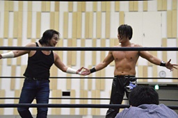 HARASHIMA蒼魔刀狙う、佐々木カウンターのドロップキック(左写真)。両軍タッチ。