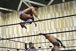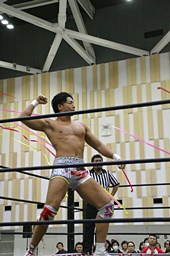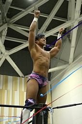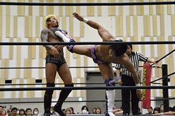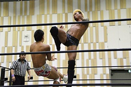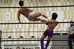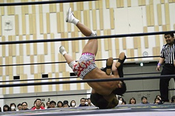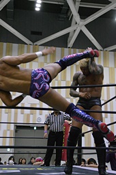 遠藤首投げ、背後からドロップキック(右写真)、その場跳びシューティングスタープレス、カウント2。
