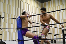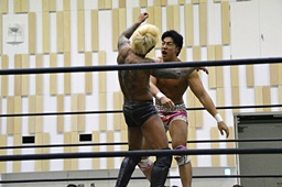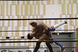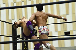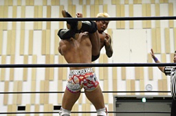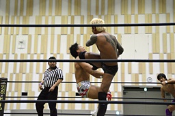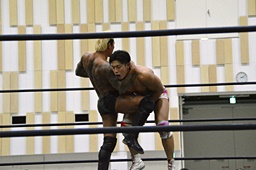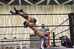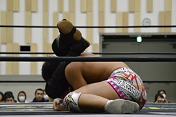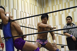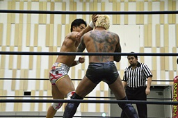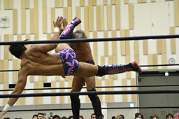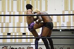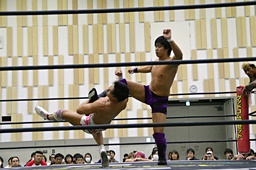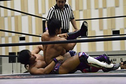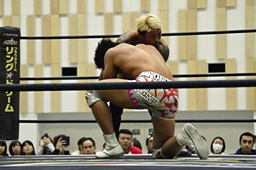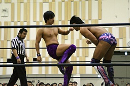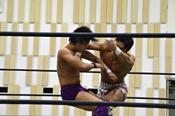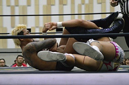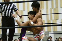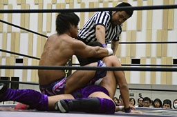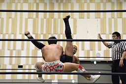 倒して上に(右写真)、ニーオンザベリーからカバー、カウント2。竹下立ち上がって遠藤にタッチ。坂口も梅田にタッチ。