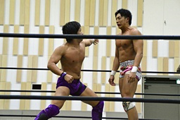 梅田エルボー(左写真)、竹下もエルボー、打ち合いに。