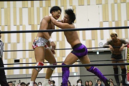 遠藤ボディスラム3連発、カバー、カウント2。ストンピング、コーナーに詰めて逆水平(左写真)、竹下にタッチ。