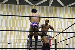 坂口ミドルキック(右写真)、カウント2。エルボー打ち合い、坂口ヒザ蹴り、梅田にタッチ。