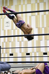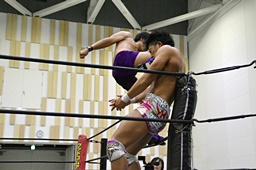 エプロンからトップロープに飛び乗ってスワンダイブミサイルキック(左写真)。