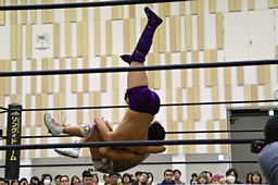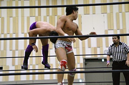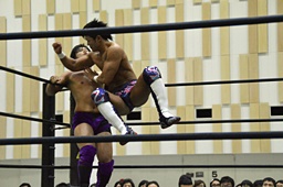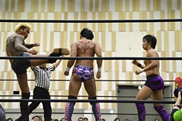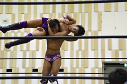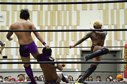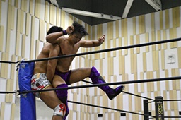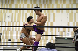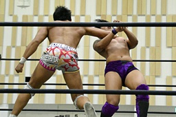 遠藤梅田をロープに振ってケブラドーラ・コン・ヒーロ(左写真)、