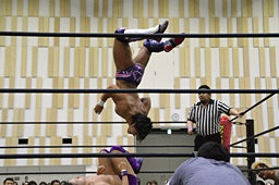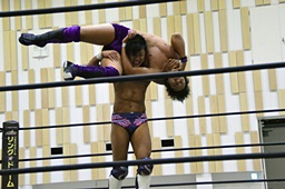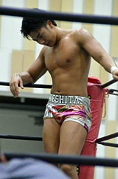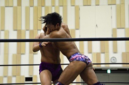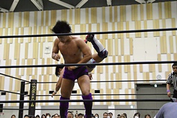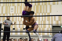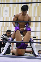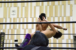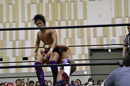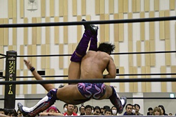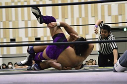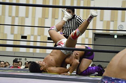 梅田ラリアットかわして逆さ押さえ込み(右写真)、カウント2。