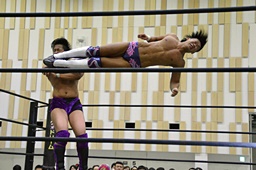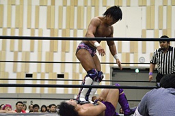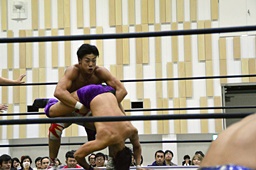 梅田ロープに飛ぶ、遠藤カウンターのドロップキック(左写真)。