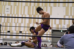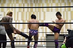 串刺しドロップキック狙うが竹下はカウンターのラリアット(左写真)、遠藤を呼び込む。