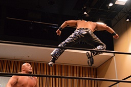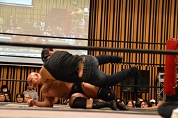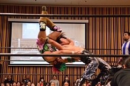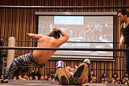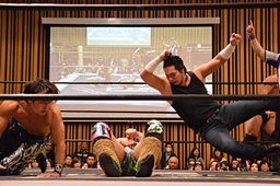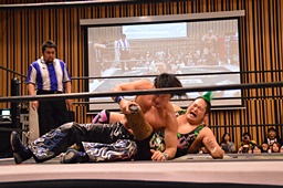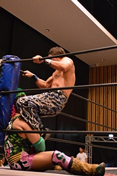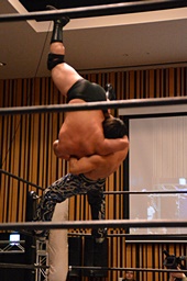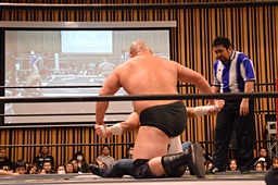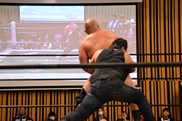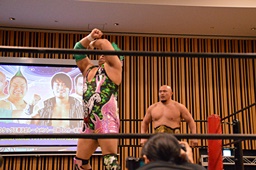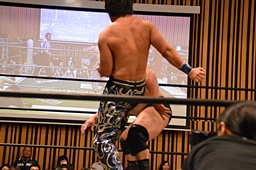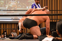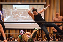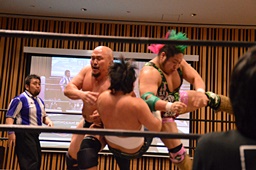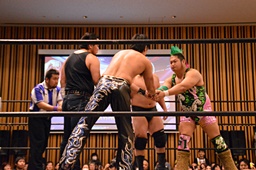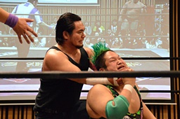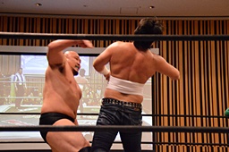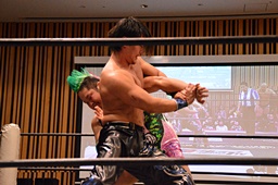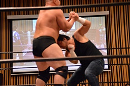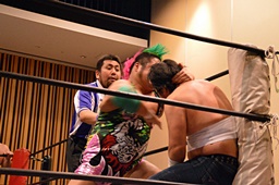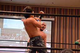 大家ヘッドロックに切り返し自軍コーナーに、HARASHIMAにタッチ。入江ヘッドロック、HARASHIMAが切り返して入江の腕を取る(右写真)。