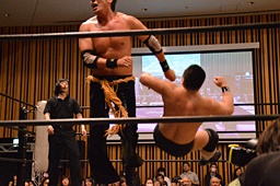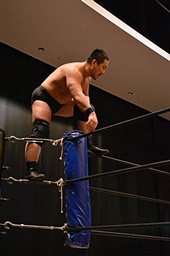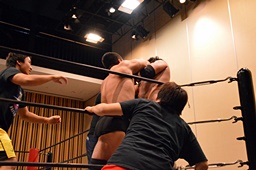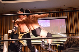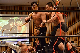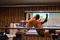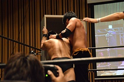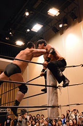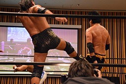 チョップの打ち合い、KENSOロープに飛んでショルダーブロック(右写真)、