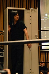 KENSO高木をロッカーに入れ扉を閉める(右写真)