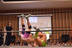 ワンチューロブレーンバスター狙う、岩崎ブロックして逆に投げる(右写真)。