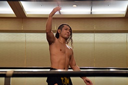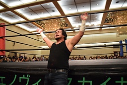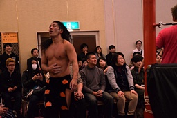 大家「高梨、強いじゃねえか。俺は今日確かにお前に負けた!しかし俺は、俺自身に負けた!俺自身に負けて、俺は悔しい!だけど、こんな悔しいことを俺は何回も味わってきてんだよ!それでもあきらめないでやってきたから、今私はここに立っているんでしょうが!そうでしょうがっ!あなた方も夢とか希望とか未来とかあると思います!こんな俺でもリングでずっと立ち続けることができた!北海道での試合は13年ぶりなんだよ!そこから這い上がってこれたんだよ!だからそういう意味も込めて、お前たちも諦めるな、頑張れと言う意味で締めるから!いくぞー!頑張れ、俺!」(左写真)