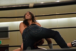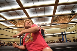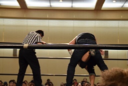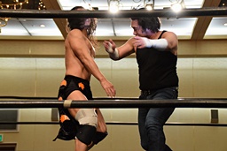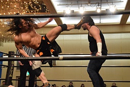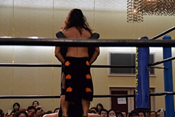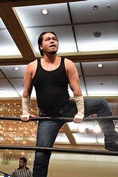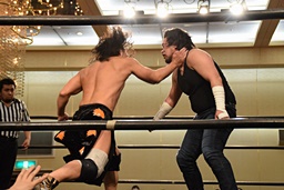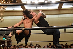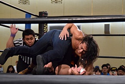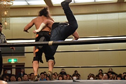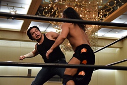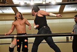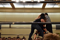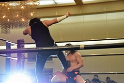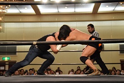 高梨パンチ、大家エルボー、高梨かわしてフロントネックロック(右写真)、大家ロープ。5分経過。
