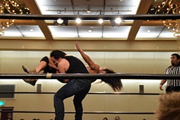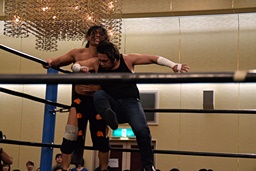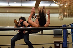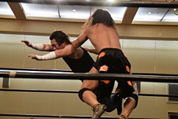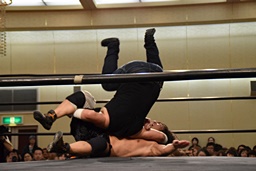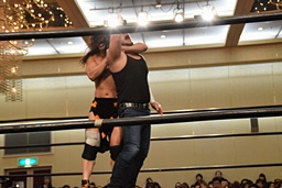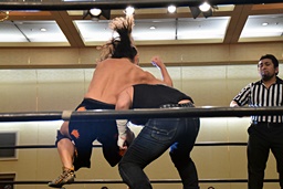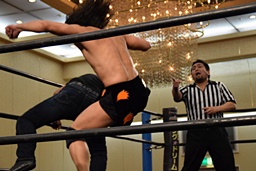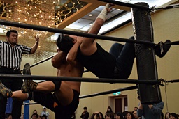 高梨ブレーンバスター狙う、大家ブロック。高梨ネックブリーカードロップ(左写真)。