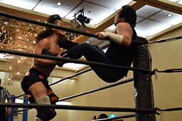 大家がリングに戻るべくロープをまたぐと高梨キック(右写真)、