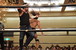 高梨コーナーで踏みつけ、カタプルパでノドをサードロープに強打させる(左写真)。