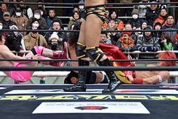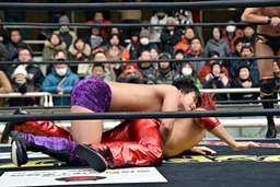 高梨をエプロンに出して石井と高尾がサンドイッチドロップキック(右写真)。
