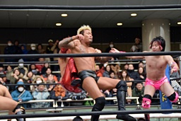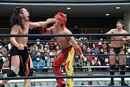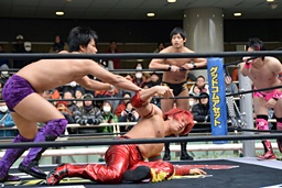ロープに飛んでドロップキック(右写真)、梅田にタッチ。