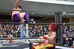 石井ボディスラムからサマーソルトドロップ(左写真)、カウント2。高尾にタッチ。