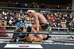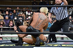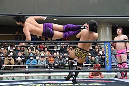 梅田カウンターのドロップキック(左写真)、坂口にタッチ。