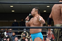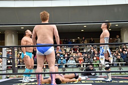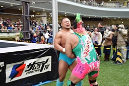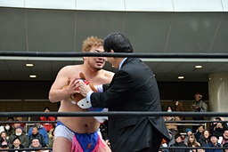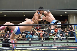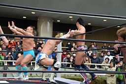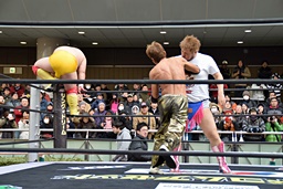 用意した作戦があっさり失敗に終わり、普通に乱闘開始。入江が松永にチョップ(右写真)、松永も打ち返す。