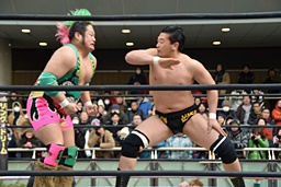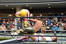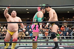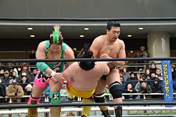 遠藤がロープに飛ぶ、ディーノと大石3D(左写真)。