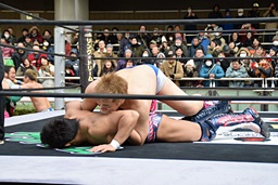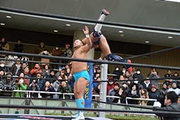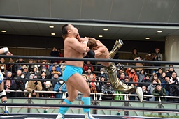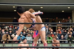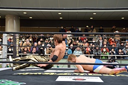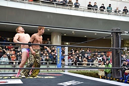 遠藤が伊橋の背中にドロップキック(左写真)。5分経過。