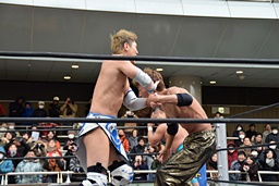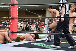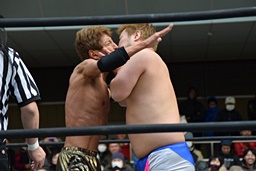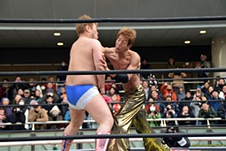 ディーノ遠藤をコーナーに振って突っ込む、遠藤カウンターのキックからフランケンシュタイナー(左写真)、