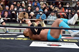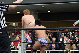 ディーノは松野の頭を男色タイツに突っ込んで一周(右写真)、男色ドライバー、カウント3。