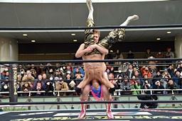遠藤入ってきた入江にガットショット、ロープに飛ぶ、入江キャッチしてブラックホールスラム(左写真)。