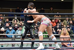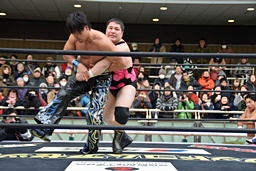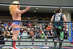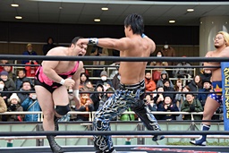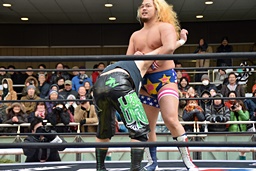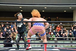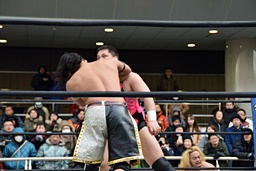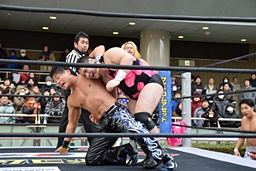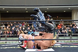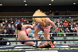 HARASHIMA切り返してハンマーロックからヘッドロック、フライングメイヤー(右写真)、アントンはヘッドシザーズで返す。彰人と福田にタッチ。