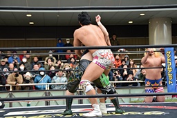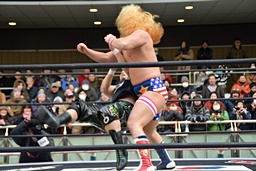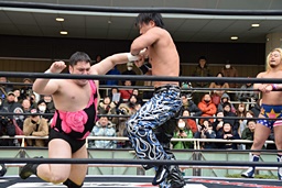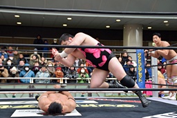 ウラノコーナーに振る、アントン切り返して突っ込む、ウラノカウンターのキックからドロップキック(右写真)、彰人にタッチ。