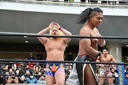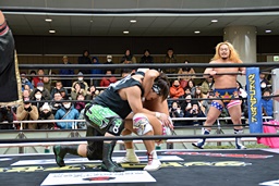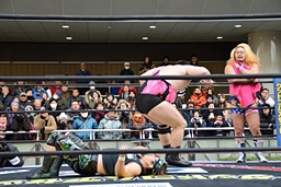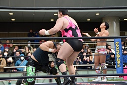 ロープに飛んでフォアアームドロップ(左写真)、竹下にタッチ。