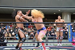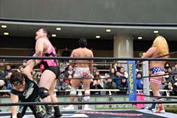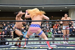 3方向に串刺しラリアット(左写真)、竹下がウラノをカバー、カウント2。アントンにタッチ。