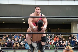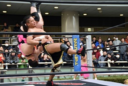 彰人アントンをコーナーに振って串刺しスピアーから水車落とし(右写真)、カウント2。