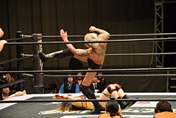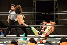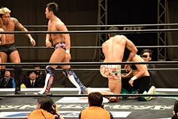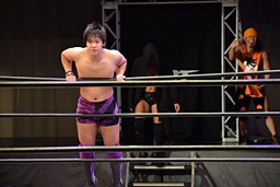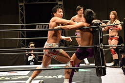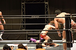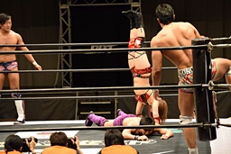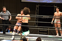 遠藤コーナーに振って突っ込む、梅田カウンターのキック、ロープに飛ぶ、遠藤ソバット。遠藤ロープに飛ぶ、梅田カウンターのドロップキック(右写真)、木村にタッチ。