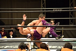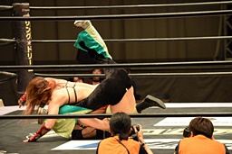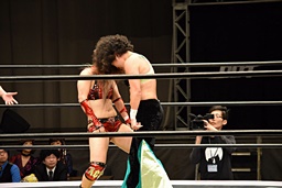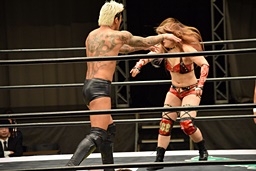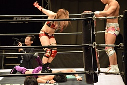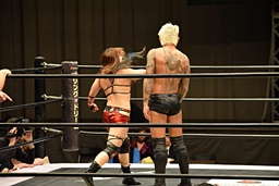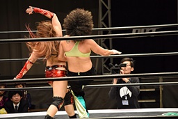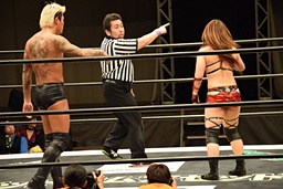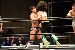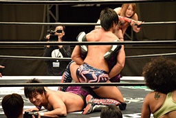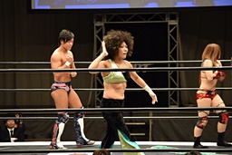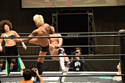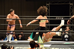 ロープに振ってゼロ戦キック(右写真)、DDT。イオにタッチ。
