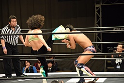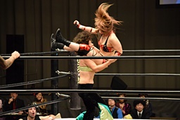 木村バックドロップ、イオ着地してアッパーエルボー(右写真)、