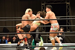 2人をコーナーに振るとイオが突っ込む、木村カウンターのビッグブーツ(右写真)。