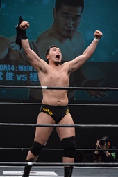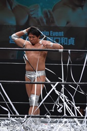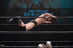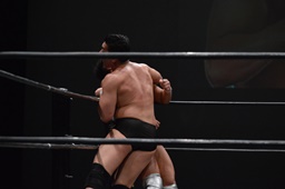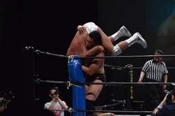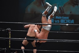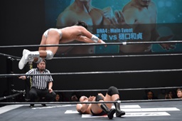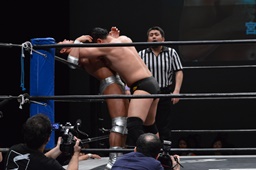 樋口をリングに戻すとコーナーに上ってフロッグスプラッシュ(右写真)、カウント2。